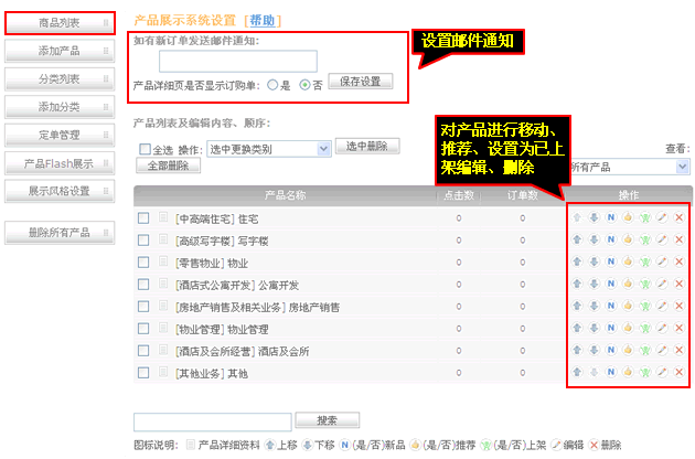 2、设置“邮件通知”,产品管理操作可对产品进行移动、推荐、上架、编辑、删除等操作。