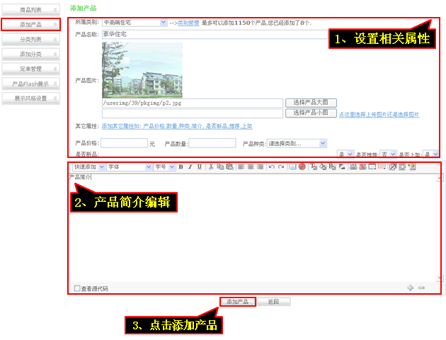 3、添加产品,可以对产品进行“属性设置”,编辑好“产品简介”后点击“添加产品