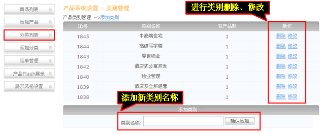 4、分类产品,可以添加、修改、删除产品分类