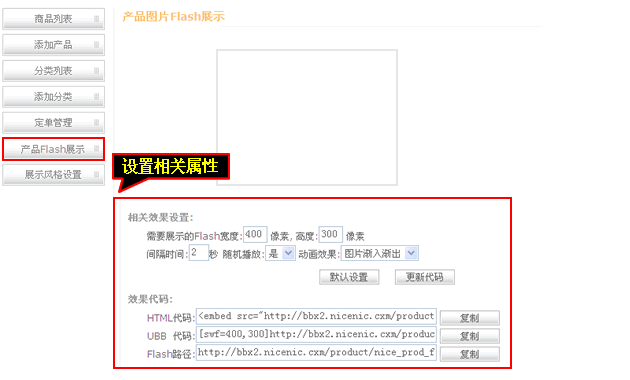 6、产品FLASH属性可以设置产品展示FLASH效果