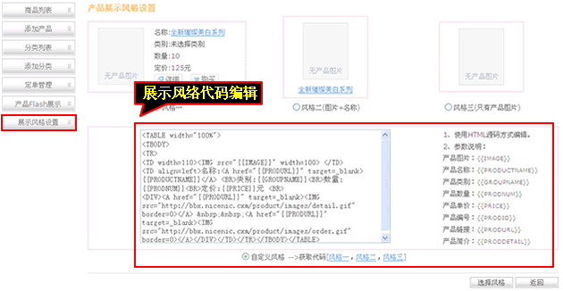 7、产品展示风格可以“自由编辑产品展示风格代码”,右侧有产品的各项参数